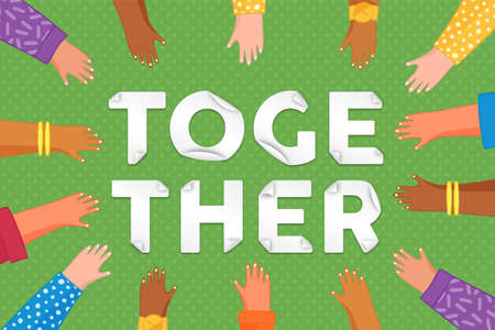 Together text quote design with people hands raised up. Diverse cartoon team illustration for business or community equality.