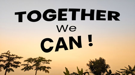 A bold motivational message, TOGETHER We CAN, against a warm sunrise sky with tree silhouettes, symbolizing unity and achievement.
