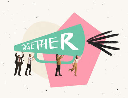 Creative design. Contemporary art collage. Employees, office workers standing together symbolizing successful teamwork