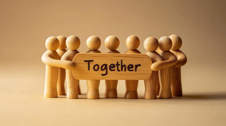 This image depicts a group of wooden figures holding a sign that says together, representing themes of unity, teamwork, and community in a warm setting.