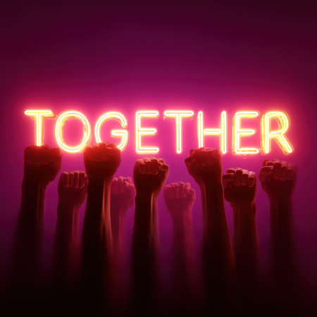 Multiple fists are raised in silhouette against a vibrant background, illuminated by neon light.