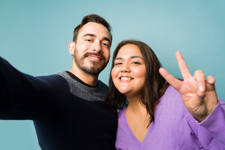 Personal perspective of an attractive young couple making the peace sign while taking a selfie together
