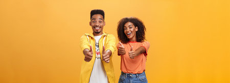 Two friends like perfect and awesome plan. Portrait of joyful friendly-looking optimistic african american female and male showing thumbs up in approval and agreement gesture smiling broadly
