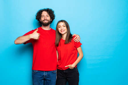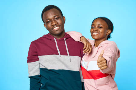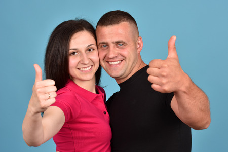 Young family on a blue background. Perfect pair. A good relationship. Strong friendship.