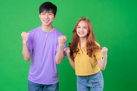 Young Asian couple wearing white t-shirt on grey color wall, Mock up template for design print concept