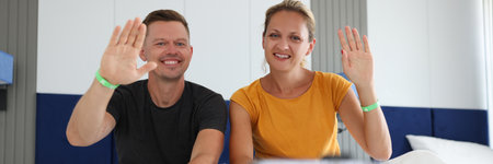 Man and woman sitting in hotel bed and waving hand to cell phone camera