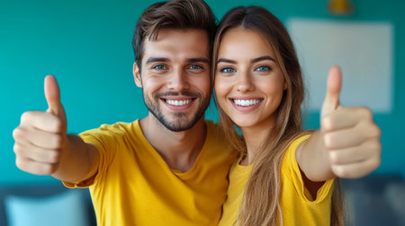 Happy young lovely couple showing thumbs up and looking at the camera over yellow background