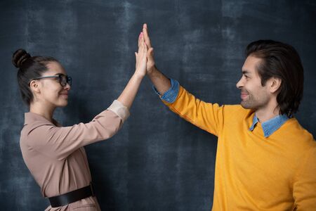 Business team giving a high fives gesture as they laugh and cheer for their success.