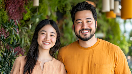 A black man and an Asian woman share a joyful moment smiling widely. The setting highlights their happiness with an emphasis on diversity and family unity.