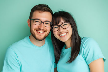 Diverse couple expresses happiness and connection, wearing matching blue t shirts and glasses while smiling at the camera
