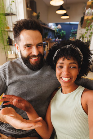 A cheerful young couple with waves to the camera in a vibrant and colorful cafe environment, expressing joy and genuine smiles.