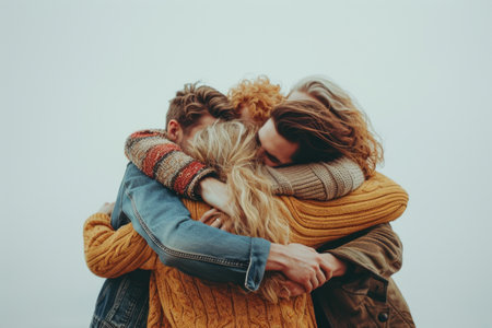 Happy friends hug smile outdoor autumn, close portrait joyful embrace nature, warm sweater cozy mood