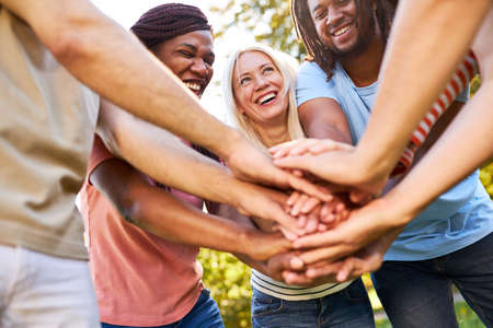 Multicultural group of friends stacking hands as a symbol of success and team building