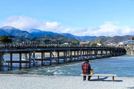 Kyoto,Japan-February 24, 2020: Togetsu-kyo Bridge in Arashiyama, Kyoto
