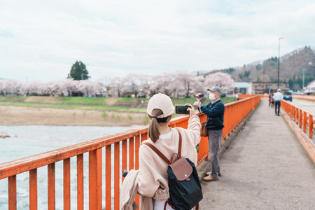 Woman tourist sightseeing Sakura Cherry Blossom in Spring. Happy traveler travel near Hinokinai River riverbank in Kakunodate town, Semboku District, Akita Prefecture, Japan. Landmark and Vacation