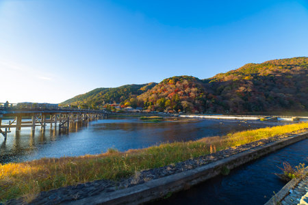 Togetsukyo bridge near Katsuragawa river in Kyoto in autumn wide shot