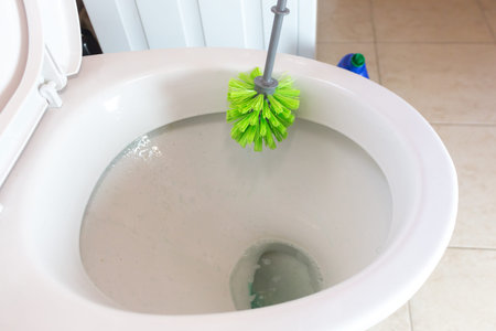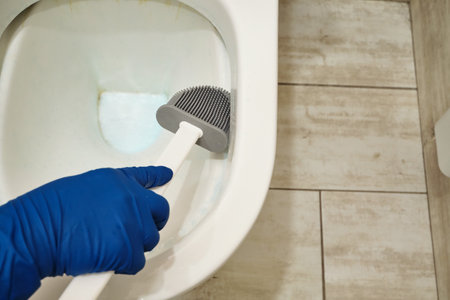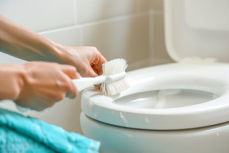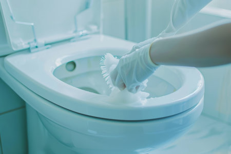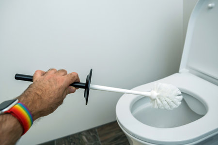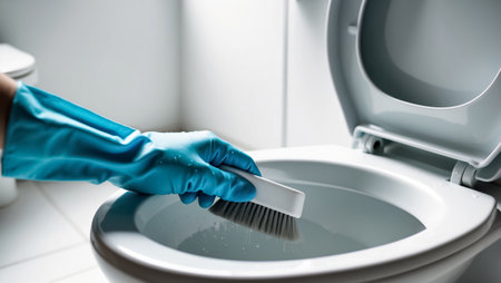 Hygienic hands on toilet cleaning with brush, clean white toilet and hands in high quality image