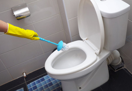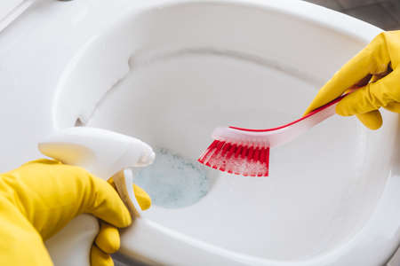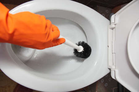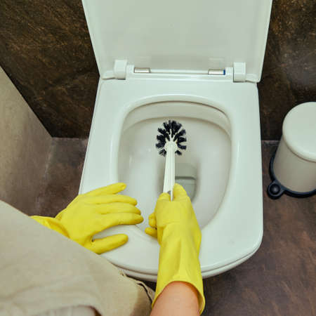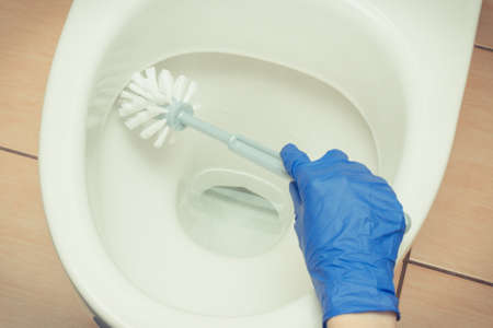 Hand of cleaner using brush for cleaning toilet in bathroom. Household duties concept