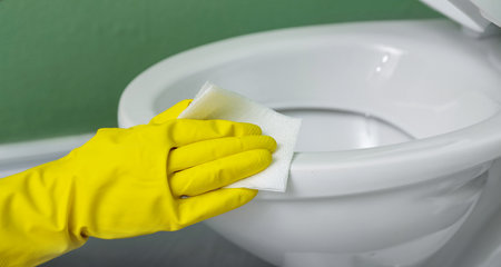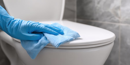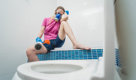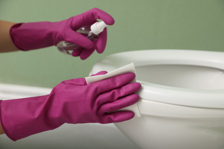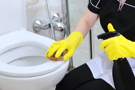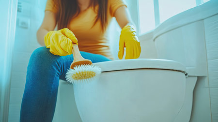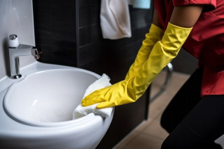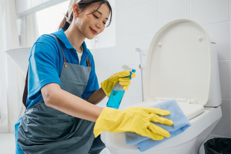 Dedicated maid in rubber gloves scrubs toilet seat with cloth ensuring hygiene in the bathroom. Her focus on cleanliness highlights the essence of housekeeping. Housekeeper healthcare concept