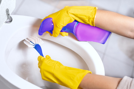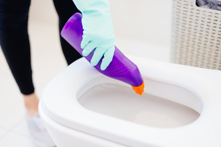 Woman in gloves with detergent washing the toilet close-up. Bathroom cleaning, sanitation and hygiene in the house