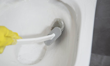 Hygienic toilet cleaning with brush. hands-on demonstration of effective cleaning