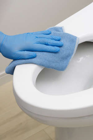 Maid wears gloves wiping toilet seat with cloth for bathroom cleanliness. Her attention to hygiene and purity embodies a diligent housekeeper effort. Housekeeper healthcare concept