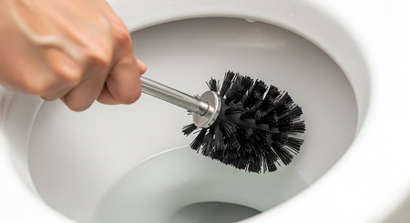 A hand holds a black toilet brush with a stainless steel handle inside a white ceramic toilet bowl. The scene focuses on cleaning and hygiene in a domestic bathroom setting.