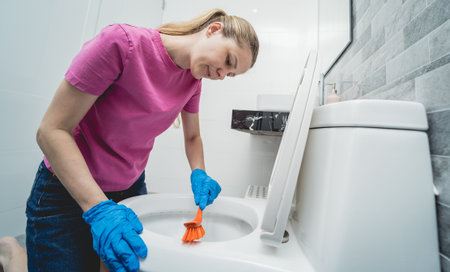 Young housewife diligently scrubs and cleans the toilet bowl in bathroom