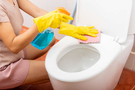 Close up hands women wearing orange protect glove using liquid cleaning solution cleaning flush toilet, disinfection and hygiene concept.