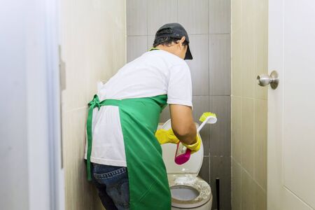 Professional cleaning service company employee in rubber gloves cleaning a toilet bowl in bathroom