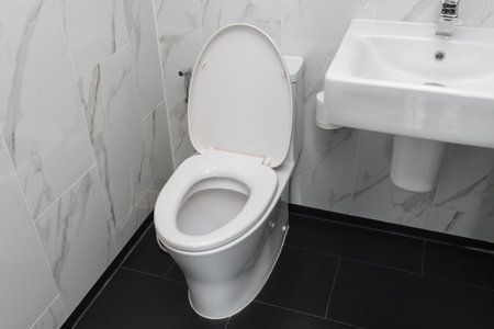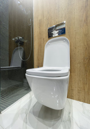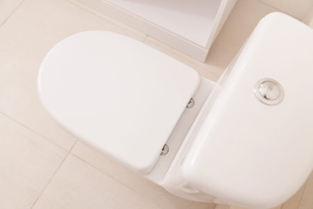 close up view of ceramic clean toilet bowl with lid in modern restroom