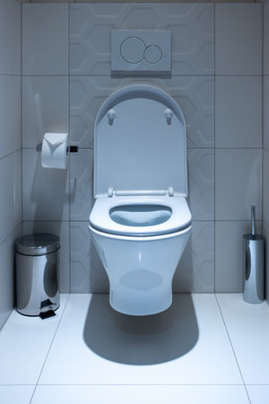 soft focus flush toilet and silver bin in white bright toilet room - clean toilet room stomach health background concept