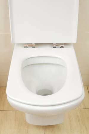 Close-up of toilet bowl. White toilet in the bathroom. Public toilet in the airport or restaurant, cafe.