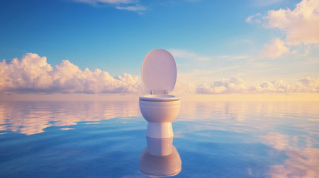 An imaginative image featuring a white toilet sitting in a calm ocean setting, surrounded by colorful clouds under a dreamy sky at sunset.