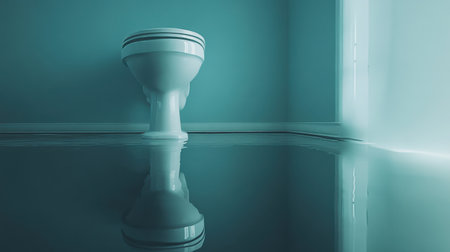 A sleek bathroom featuring a spotless toilet with a striking water reflection on the floor. The modern design emphasizes cleanliness and minimalism.