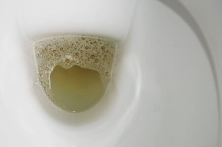 Transparent clean water with air bubbles in white toilet bowl. Focus at the center of image. Black and white image