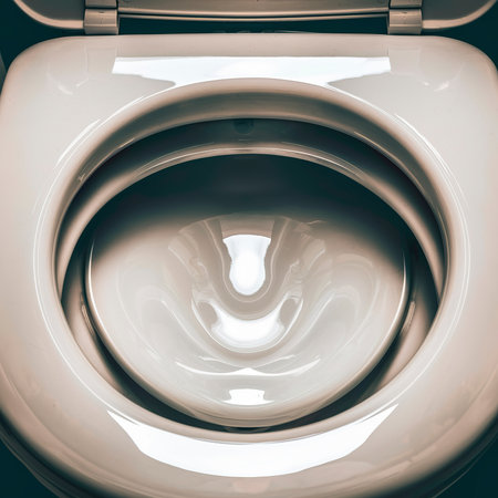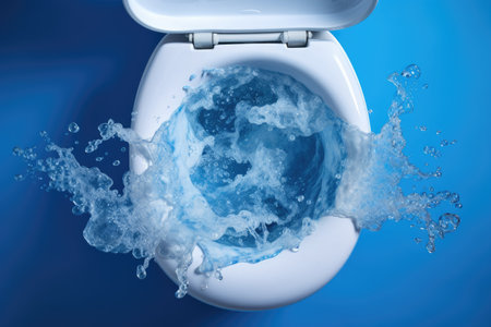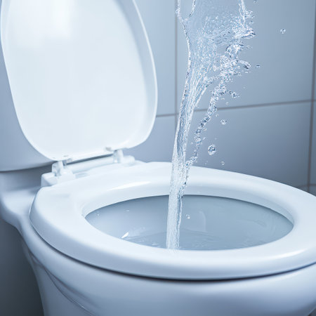 Water is pouring into a pristine toilet bowl in a modern bathroom setting showcasing cleanliness and functionality during installation.