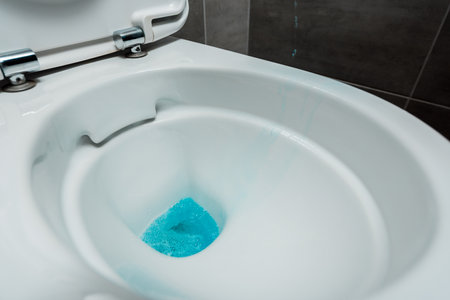 close up view of blue liquid detergent pouring into ceramic clean toilet bowl in modern restroom with grey tile
