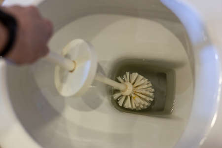 Female with sponge in a hand trying to stop a toilet overflow, blurred motion close-up