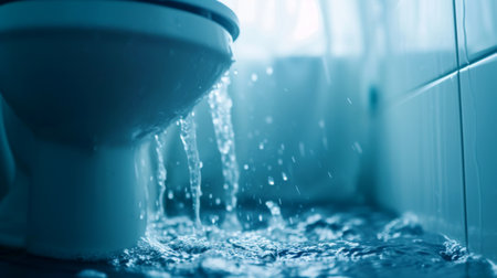 A close-up shot of a toilet leaking water, with the water cascading onto the tiled floor in a bathroom.