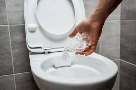 cropped view of man throwing crumpled plastic bottle in toilet bowl in modern restroom with grey tile