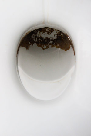 a toilet with traces of limescale, salt and stone deposits on the tiles