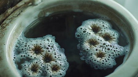 A unique close-up of bubbles forming in a dark liquid, showcasing intricate patterns and textures in an artistic perspective.