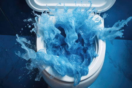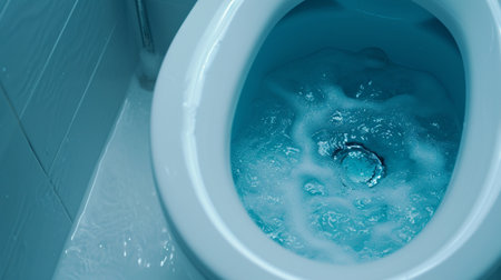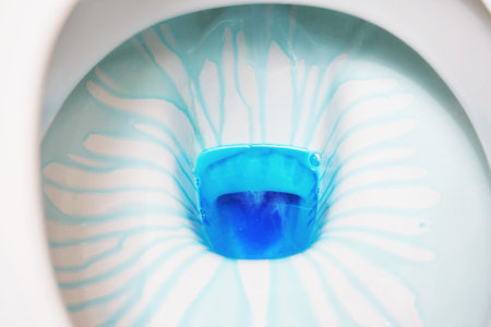 Closeup view of toilet bowl during cleaning with blue detergent. Housekeeping theme backgrounds