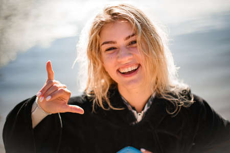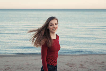 Portrait of happy smiling laughing carefree white Caucasian young beautiful woman with messy long hair on windy day outdoor at sunset on beach by water, looking in camera