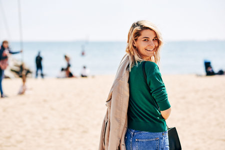 Portrait of beautiful blonde woman smiling and enjoying the warm weather on the beach. Pretty female walking on the beach against calm sea, blue sky background with copy space for your content. Travel