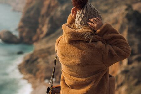girl in a brown fur coat, in a knitted hat with a boumbon, with flying hair on a cliff, against the backdrop of rocks, mountains and the sea. cloudy sky, clouds.