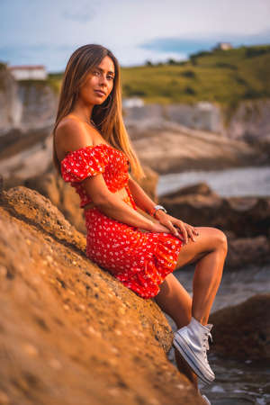 A young brunette Caucasian woman in a red dress on the beach of Itzurrun in the town of Zumaia, Gipuzkoa. Basque Country. Lifestyle session, portrait sitting on a green sea rock with the people above