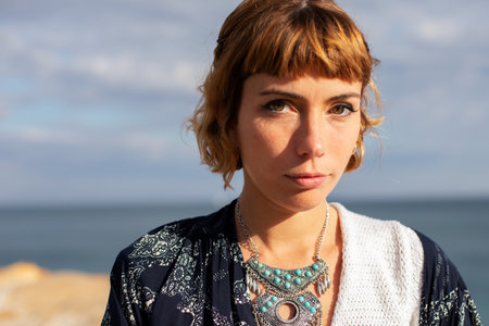 Portrait of a brunette woman with a mysterious look with long hair, wearing a hat and an orange jacket. In the background the sea and the horizon line.