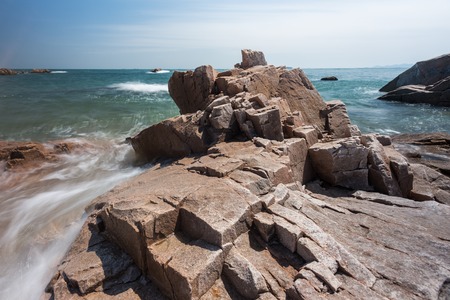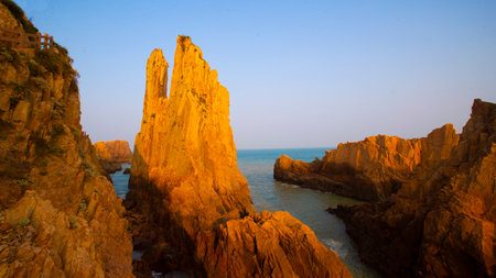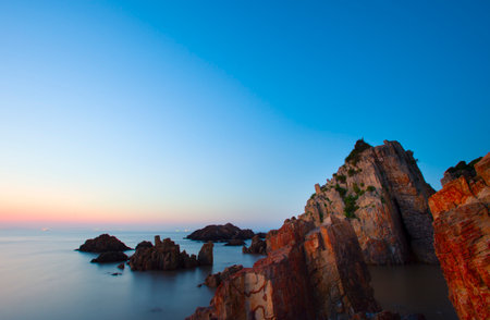 Sunset view of huge rock located on the coast of East Sea, Zhejiang, China
